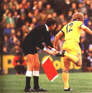Non ci voleva questa nuova moda che da un po' di tempo ha preso piede negli stadi inglesi. Per aumentare un po' la drammaticità i tifosi lanciano uvetta sultanina sul terreno di gioco. Ciò provoca presto una pappetta sulle scarpe dei giocatori che sono costretti a vere e proprie pattinate per rimanere in piedi. Anche se il regolamento non lo prevede ufficialmente sono i guardalinee (nella foto) a preoccuparsi di rimuovere la patina di uvetta sultanina dai tacchetti degli atleti che fanno spesso la figura dei bagonghi.